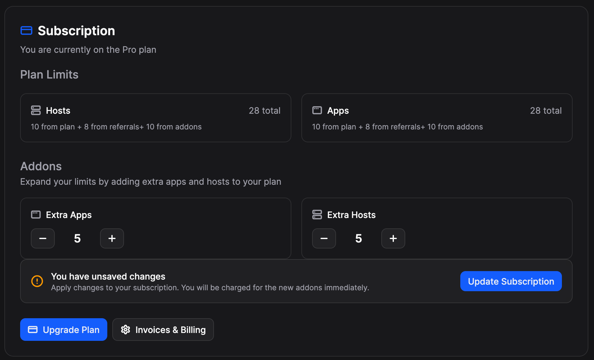 Our customers' needs are growing, and so are we. Now you can change your plan by adding extra apps or hosts to your subscription. Go to Settings ā Subscription and update your plan in just a couple of clicks. The additional apps and hosts are charged $1/ month. Psst: Want to get more out of DollarDeploy for free? Refer to other users, and for every subscriber, you will get 1 app + 1 host for free!